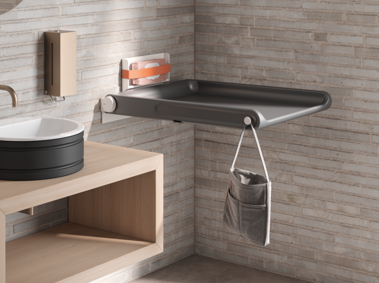 The new HEWI baby changing table combines an easy-to-clean lying surface made of PUR foam in iron grey with robust metal components in matt grain white. The braked fold-down function enables smooth handling, while side hooks and a clamp compartment offer additional comfort and convenience. The changing table combines the highest safety standards and comfortable handling with a modern design that blends seamlessly into public sanitary areas. The baby changing table was designed by Holscher Design, a renowned and award-winning strategic product design agency from Denmark with over 50 years of experience.