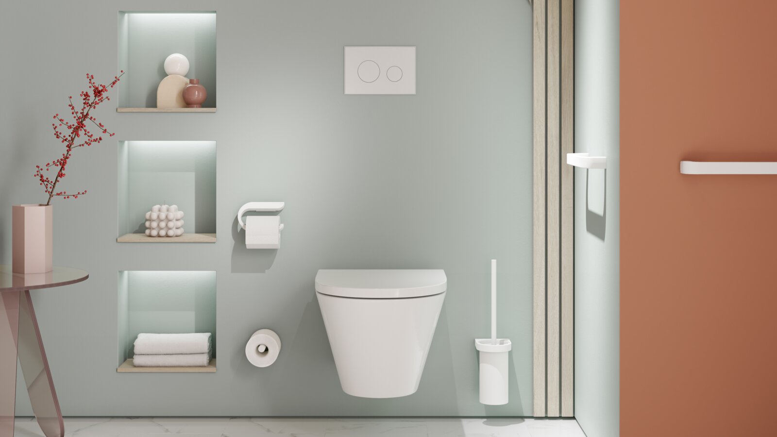 One example of a high-quality design solution is the System 162 from HEWI. This impresses with a straightforward design language and a clearly defined choice of materials. The precise mitre cut, which creates an elegant look, is particularly characteristic. The system is available in a high-quality chrome-plated version, in matt polished stainless steel, with PVD surfaces or powder-coated. Inserts made of satinised glass or high-quality polyamide are also available to round off the design;