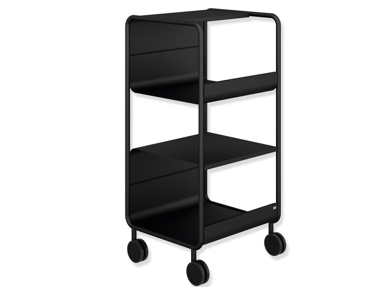 The side trolley is available with powder-coated surfaces in high-gloss white or matt black with elegant chrome elements.